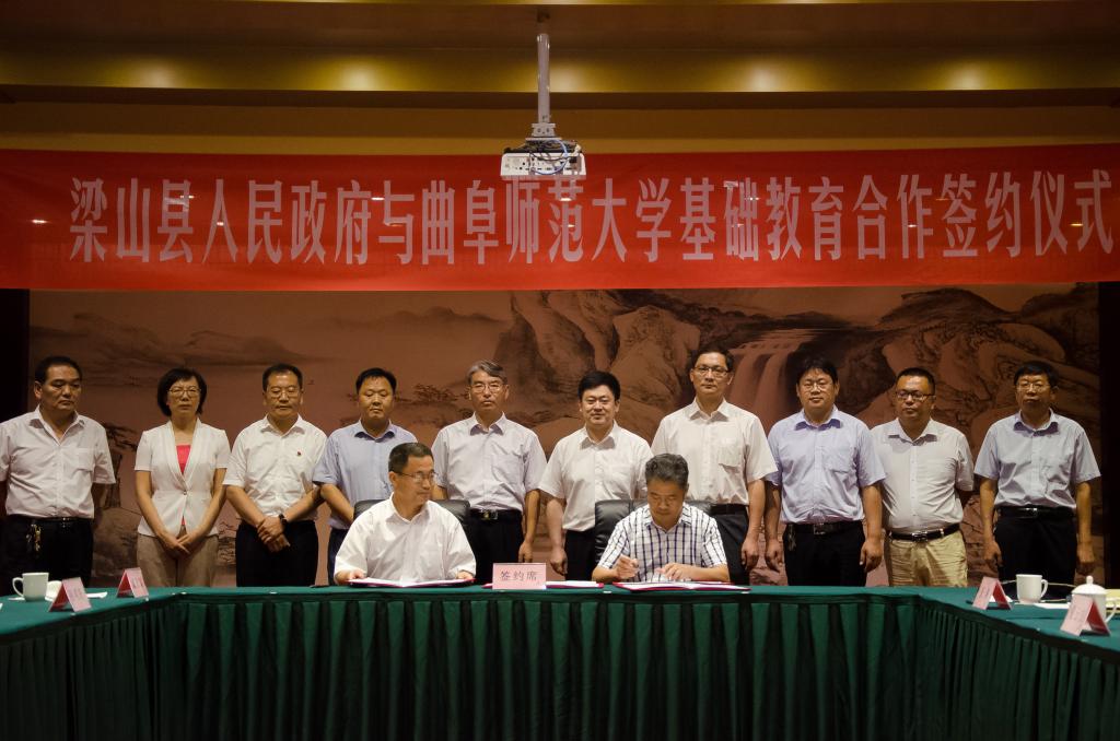 7月28日上午,我校与梁山县人民政府基础教育合作签约仪式在梁山县举行,根据此次签署的合作协议,校地双方将共建玩球通中国有限公司官网附属梁山中学。我校党委书记戚万学,副校长扈庆学,副校长夏云杰,梁山县委书记贾治阜,县委副书记、县长侯典峰,县委常委、县委办公室主任李士兵,县委常委、县委组织部部长王建,出席签约仪式。我校服务地方与对外合作办公室、梁山县教体局负责人参加仪式。签约仪式由梁山县副县长孙颖主持。
