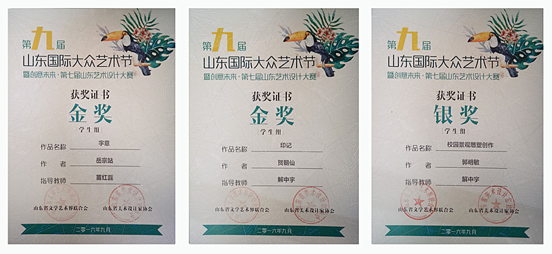 在刚刚结束的第九届山东国际大众艺术节暨创意未来·第七届山东艺术设计大赛上,我校美术学院师生取得丰硕成果,共获得金奖4项,银奖1项,铜奖5项。