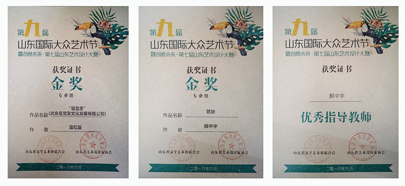 由苗红磊和解中宇老师指导的学生也取得优异成绩。其中贺朝仙作品《印记》、岳宗站作品《字意》获得金奖;郭明敏作品《校园景观雕塑创作》获得银奖;段葵作品《化界》、马晓慈作品《“解意”花草茶系列作品标志》、宋佳作品《误入北边的416号作品》、李伟作品《寂》、陈德亚作品《器植》获得铜奖。另外,我校美术学院获优秀组织单位,解中宇老师获优秀指导教师奖。