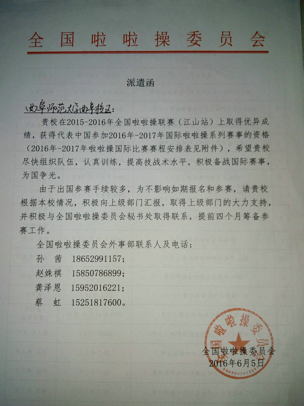 我校参赛选手虽然都是非专业运动员,但与丙组大学体育系专业、丁组高水平运动员等专业组别运动员同台竞演毫不逊色,得到了国家体育总局体操运动管理中心、中国大学生体育协会和全国啦啦操委员会的好评与认可,并给予我校代表中国参加2016-2017年国际啦啦操系列赛事的资格,颁发国际赛事派遣函。这也是我校体育项目首次获得参与国际赛事资格。