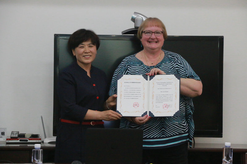 5月20日,外籍教师乔妮·斯卓姆(Joni Strohm)女士在我校从教17年特别贡献奖颁奖典礼在曲阜校区举行。副校长康淑敏出席仪式,乔妮·斯卓姆女士、国际交流合作处历任领导、她所任教的外国语学院、翻译学院负责人、同事、外籍教师代表及学生代表等出席了仪式,颁奖典礼由国际交流合作处处长梁美玲主持。