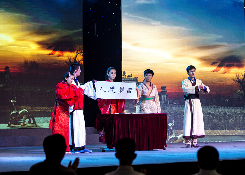 团省委书记张涛,我校校长戚万学,省委宣传部、省委高校工委、济宁市等部门负责人出席表演赛并为获奖选手颁奖。表演赛以参赛青少年学生为主体,在“齐鲁十二圣”的精彩亮相中拉开序幕。由三强选手组合成的三组“国学达人”分别从“国家富强”、“民族振兴”、“人民幸福”三个角度,围绕社会主义核心价值观主题,通过象棋、戏曲、武术等艺术表现形式,生动诠释了社会主义价值观的历史渊源和文化根源。来自“一带一路”沿线友好国家的留学生共同演绎了现代诗——《阅读中国》,表达了外国友人对中国圣贤的敬仰之情,也展现了中华文明的发展对世界文明进步起到的重要作用。表演赛后,出席领导为获奖选手颁奖。