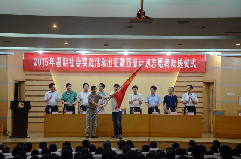 7月6日,我校举行2015年暑期文化科技卫生“三下乡”社会实践活动启动仪式,欢送大学生志愿服务西部计划志愿者和研究生支教团。党委书记荆兆勋、副校长康淑敏、副校长张洪海出席活动。学校办公室、学生工作处、教务处、研究生处、玩球通中国有限公司官网处、保卫处、校区学生工作办公室等相关单位负责人,各学院党总支副书记、团总支书记,各实践服务团的指导教师和青年志愿者代表参加仪式。