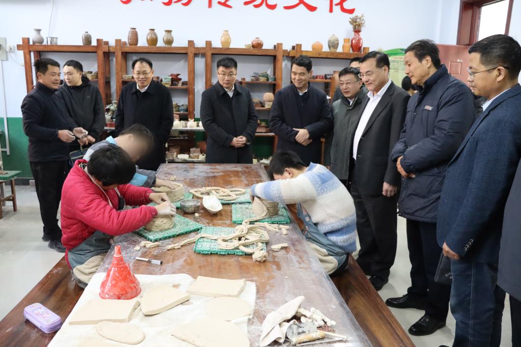 捐赠仪式结束后,陈刚一行参观了特教中心的教室、康复馆及荣誉室,了解学生就读情况,观看学生表演的“手指操”和陶艺制作课,并与区教体局、省派第一书记和工作队负责人进行座谈交流。