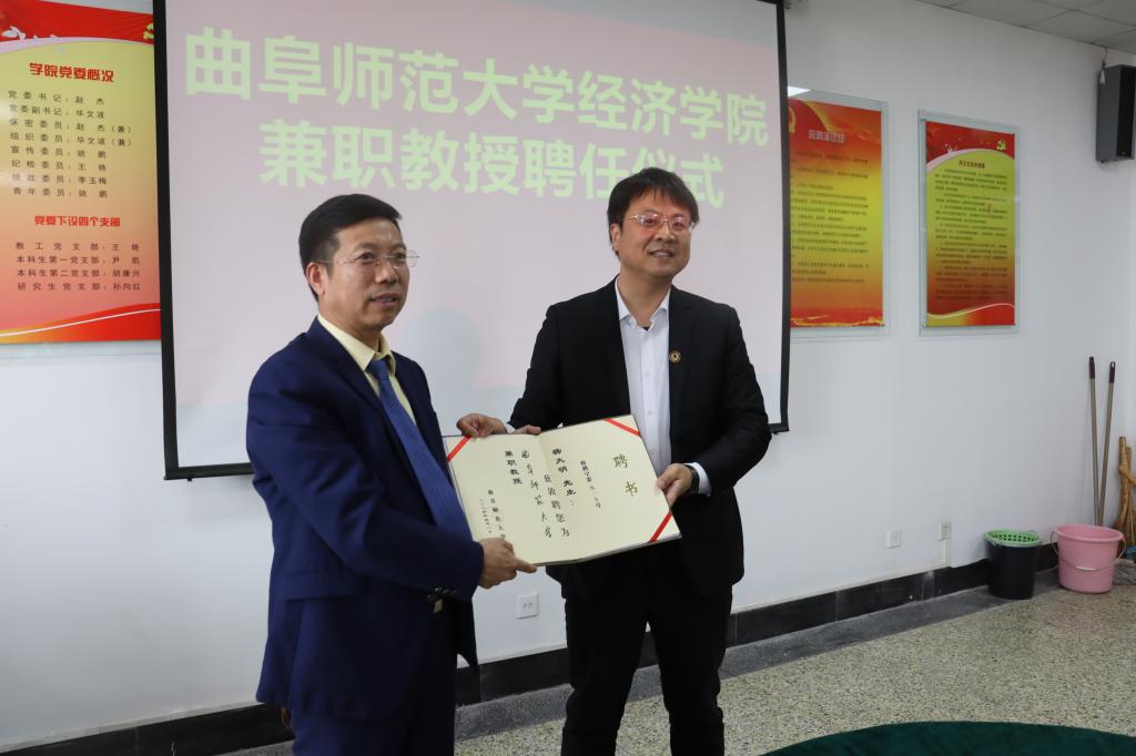 曲阜师大经济学院讯  5月7日下午,玩球通中国有限公司官网经济学院举行兼职教授聘任仪式,学校党委副书记李志红出席仪式,党委常委、副校长刘刚为商道企业集团董事长杨大明颁发兼职教授聘书。