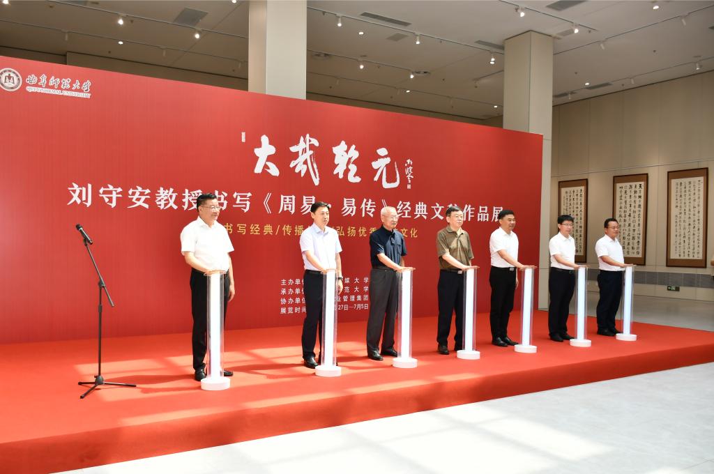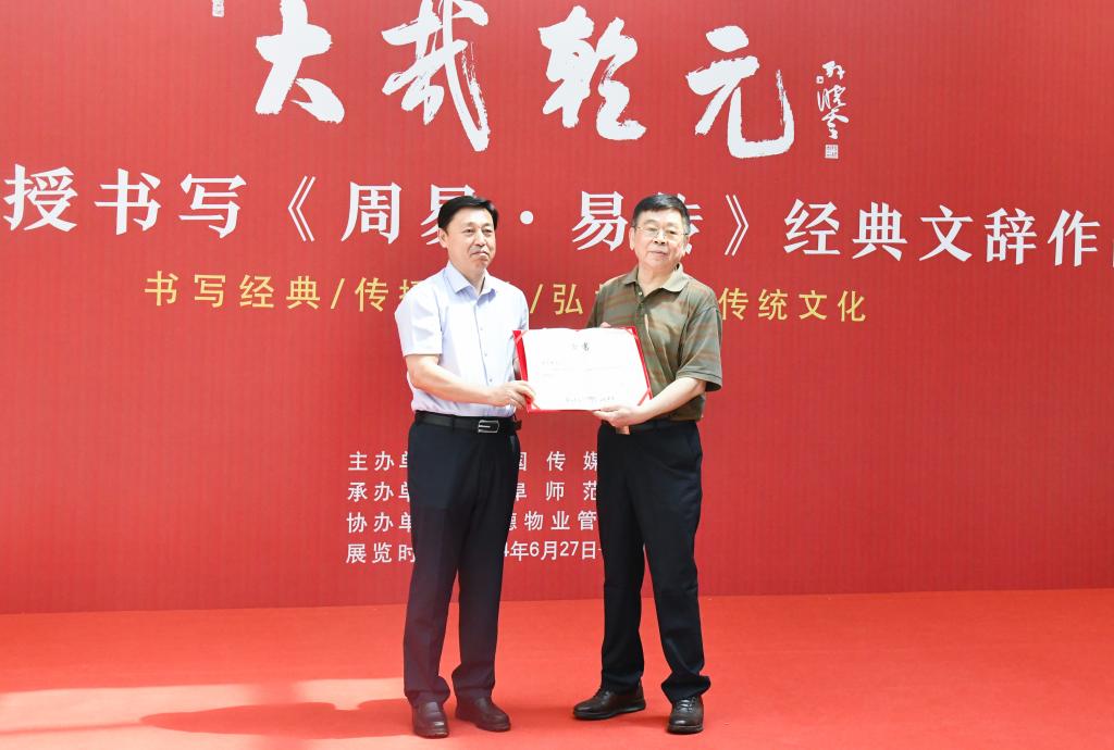 曲阜师大党委宣传部讯 丹青溢彩,翰墨飘香。6月27日,“大哉乾元—刘守安教授书写《周易·易传》经典文辞作品展”在玩球通中国有限公司官网隆重举行。中国传媒大学书写文化研究中心主任、博士生导师刘守安教授及夫人王甦英女士出席活动,曲阜师大党委书记邢光在活动中致辞,党委副书记、校长张洪海为刘守安教授颁发“玩球通中国有限公司官网美术与书法学科学术顾问”聘书,党委常委、副校长陈刚出席活动,党委常委、副校长纪洪涛主持活动。