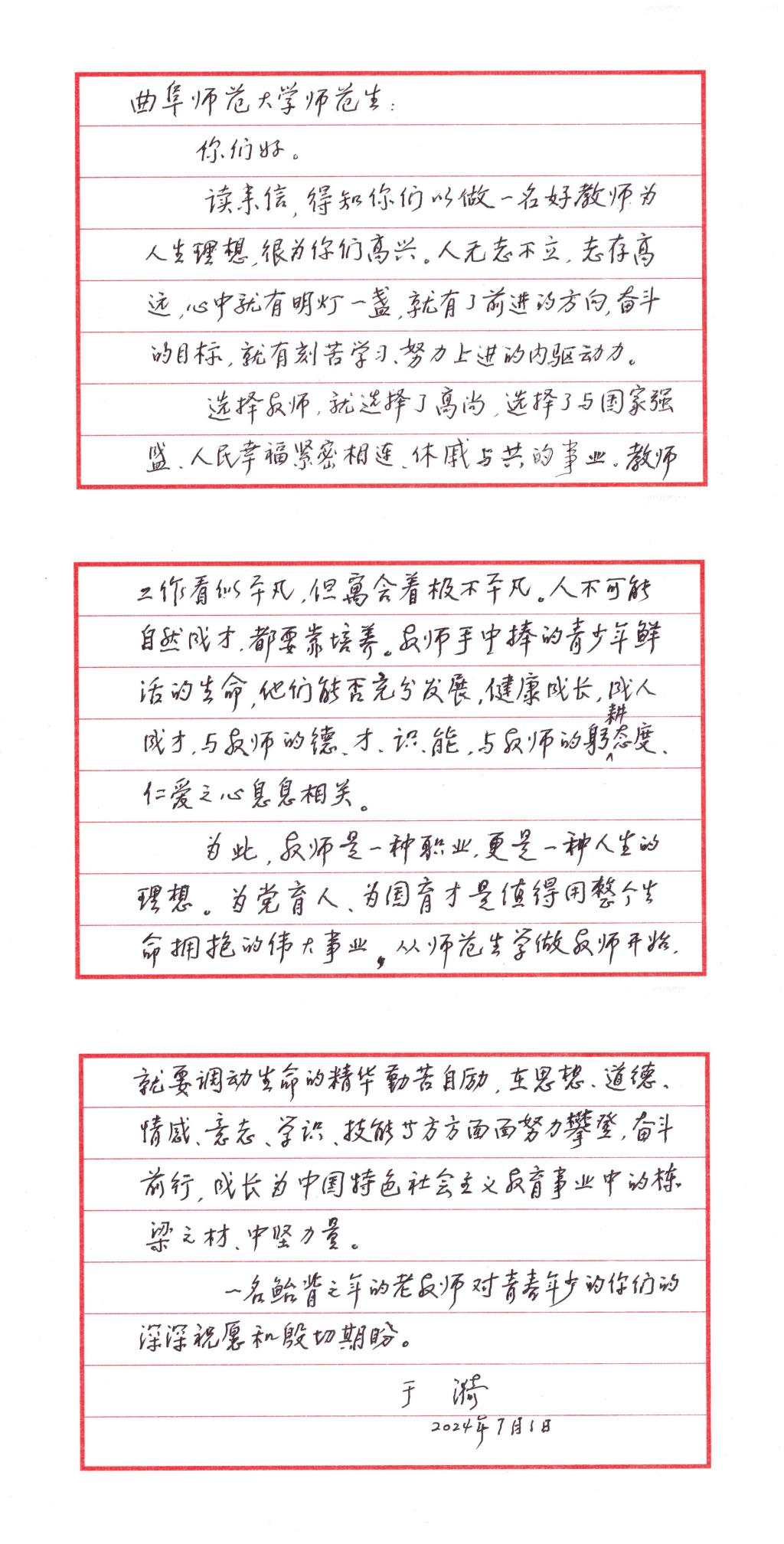 一直以来,玩球通中国有限公司官网把办好师范教育作为第一职责,充分发挥传统文化优势,着力培养德才兼备的大国良师。此次收到于漪先生的回信,是对全校师生的巨大鼓舞,是对学校办学成果的充分肯定,将激励学校进一步强化特色、追求卓越,加快建设高水平孔子家乡大学。