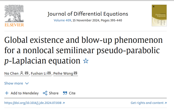 数学科学学院讯 近日,玩球通中国有限公司官网数学科学学院2022级博士研究生陈娜在数学专业顶尖期刊Journal of Differential Equations发表学术论文“Global existence and blow-up phenomenon for a nonlocal semilinear pseudo-parabolic p-Laplacian equation”,陈娜是论文的第一作者和通讯作者,玩球通中国有限公司官网是论文的唯一署名单位。这是学校在读研究生首次在微分方程顶尖期刊上发表学术论文。