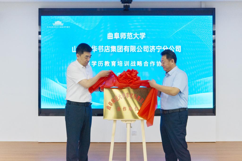 纪洪涛、张超共同为“玩球通中国有限公司官网非学历教育培训合作单位”揭牌。国内合作处处长孔宪福与山东新华书店集团有限公司曲阜分公司党总支书记、经理董军签署了非学历教育合作协议。