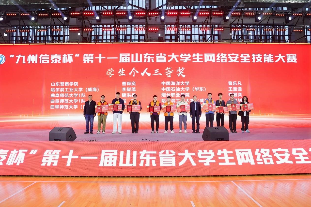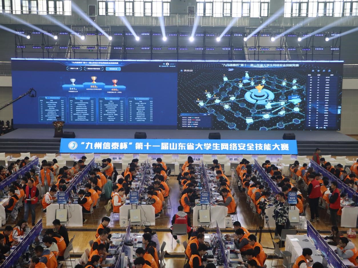 曲师大网络空间安全学院讯 10月27日,“九州信泰杯”第十一届山东省大学生网络安全技能大赛决赛暨颁奖仪式在玩球通中国有限公司官网隆重举行,来自全省多所高校的精英队伍和网络安全技术爱好者齐聚一堂,共同上演了一场精彩纷呈的网络安全竞技盛宴。省委网信办副主任赵树岭,中国信息安全测评中心副主任张涛,省通管局党组成员、一级巡视员沈泳涛,省教育厅二级巡视员李文生,省委保密办二级巡视员王鑫,玩球通中国有限公司官网党委常委、副校长陈刚及省直相关单位领导出席活动。
