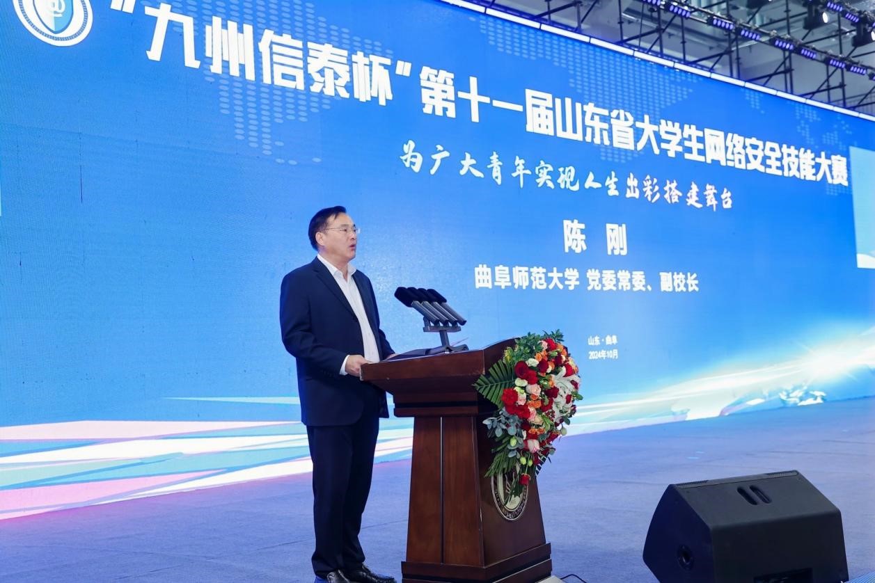 陈刚在开幕式致辞中对大赛的成功举办表示热烈祝贺,对莅临现场的嘉宾表示热烈欢迎,并简要介绍了曲师大的基本情况。他指出,山东省大学生网络安全技能大赛作为山东省官方举办的规格最高、参赛人员最多的大学生网络安全赛事,为我省网络安全建设提供了坚实的人才和智力支撑,希望通过承办本次大赛,为我校网络人才培养注入新动力,推动人才培养与专业发展同频共振。