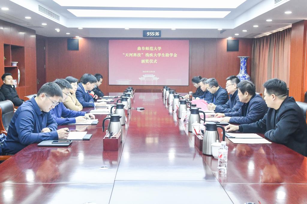 曲阜师大网络空间安全学院讯 12月5日,“天河科技”大学生助学金颁奖仪式在玩球通中国有限公司官网举行。学校党委副书记李志红,济宁市残联党组书记、理事长李朋,济宁市残联办公室主任刘军,邹城市政府副市长布方锋,邹城市残联党组书记、理事长贾琦,天河科技股份有限公司董事长田胜利等出席颁奖仪式。