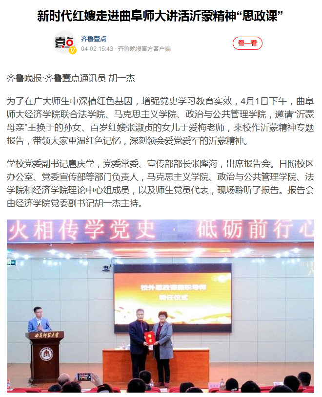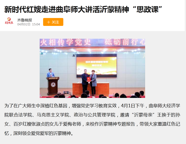 齐鲁晚报:新时代红嫂走进曲阜师大讲活沂蒙精神“思政课”