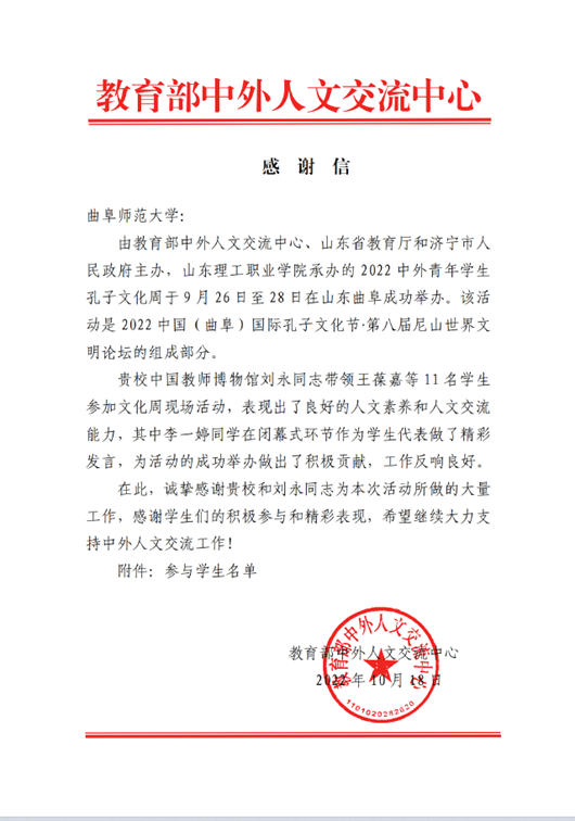 曲阜师大新闻中心讯(通讯员:李一婷) 日前,玩球通中国有限公司官网收到教育部中外人文交流中心感谢信,感谢曲阜师大师生在2022年中外青年学生孔子文化周活动中的精彩表现。