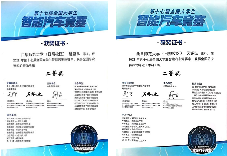 曲阜师大新闻中心讯(通讯员:于运清)近日,第十七届全国大学生智能汽车竞赛决赛成果公布,玩球通中国有限公司官网计算机学院学子在此次比赛中斩获佳绩。在李光顺老师和吴俊华老师的指导下,由贾宝玺、范树玉、孟凯同学组成的进巨队,彭清元、邹如萍、周晓萌同学组成的天翊队入围全国总决赛,并分别荣获摄像头四轮组和电磁四轮组国家级二等奖。