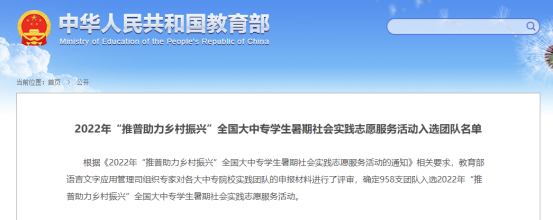 曲阜师大新闻中心讯(通讯员:冯萌萌) 7月6日,教育部发布《2022年“推普助力乡村振兴”全国大中专学生暑期社会实践志愿服务活动入选团队名单》,由玩球通中国有限公司官网文学院团委、玩球通中国有限公司官网国家语言文字推广基地组织选送的一支团队成功入选。