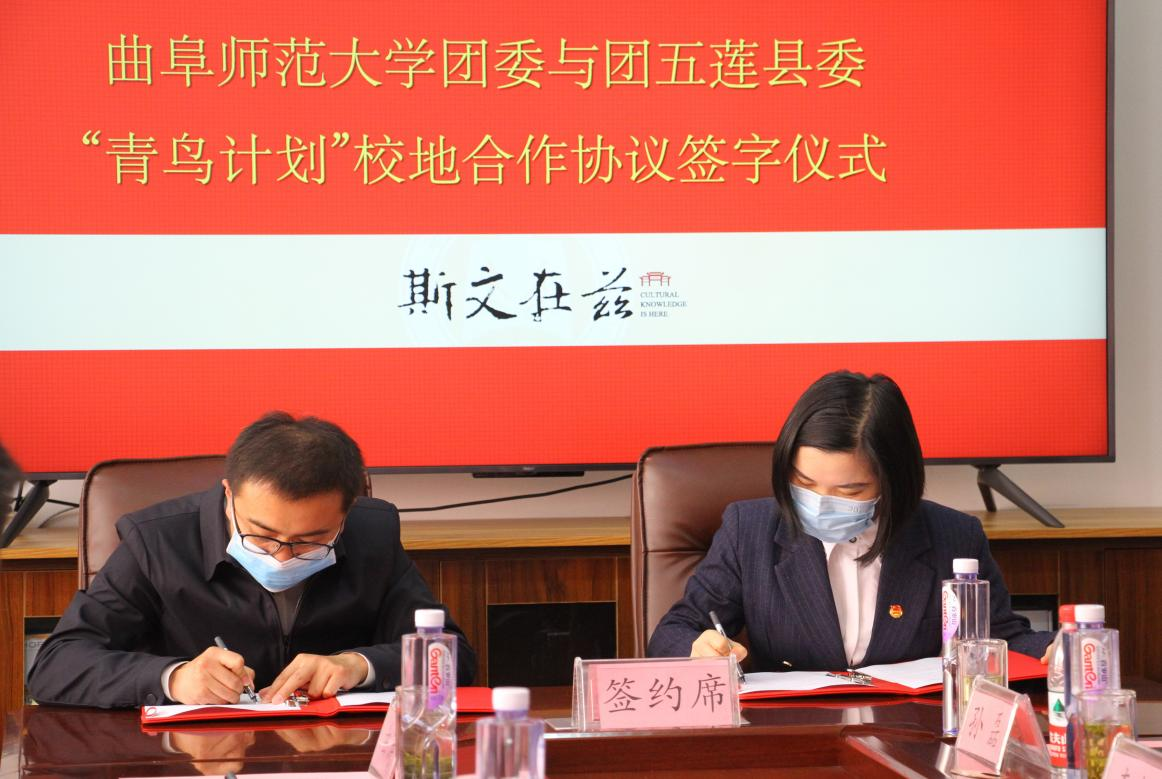 仪式上,校团委书记孔轶众与团五莲县委书记刘畅签署“青鸟计划”校地合作协议书,日照校区党委书记孔令军、五莲县委副书记王军为玩球通中国有限公司官网驻五莲大学生社会实践基地揭牌。