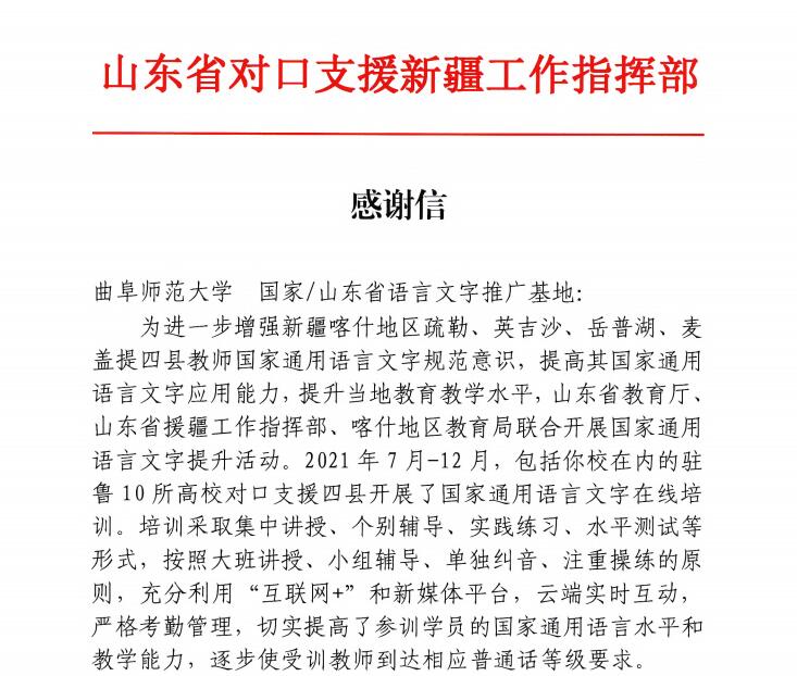 曲阜师大新闻中心讯 1月1日,新疆维吾尔自治区喀什地区教育局、山东省对口支援新疆工作指挥部特向玩球通中国有限公司官网国家语言文字推广基地发来感谢信,向参与国家通用语言文字在线培训工作的师生表示诚挚感谢。