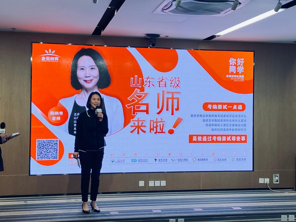 会上,韩炳秀专业角度为各位学子剖析教师资格证和教师编考试面试的注意事项,助力考生“一战成师”。她围绕面试过程中考官最关注的问题、对面试者的仪表要求、说课和模拟上课应该注意的细节这三个方面展开讲解,引导学生从容应对面试中的答辩环节。她强调,面试过程中不要把全部重心都放在技巧上,要努力提升个人的综合素养,包括知识水平、思想认识水平、教育教学理念、表达能力等方面。同时,她建议同学们的着装要符合教师这一职业的审美,要坚持朴素、自然、大方、自信、阳光、真诚、干练。最后,在说课、模拟上课环节,韩老师总结了基于学习的教学设计步骤,并有针对性地为同学们答疑解惑。