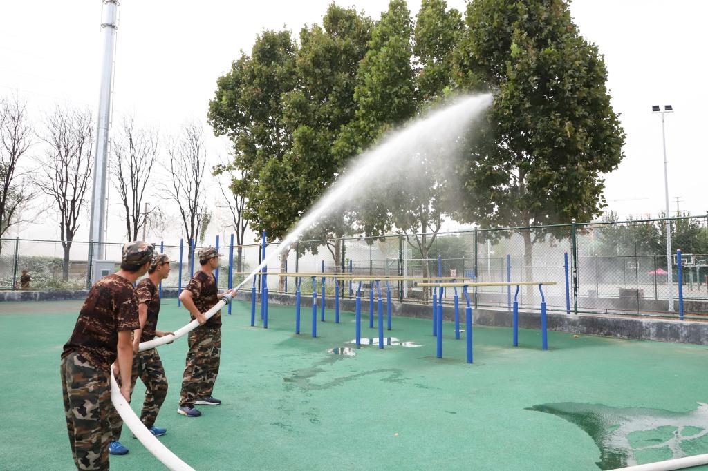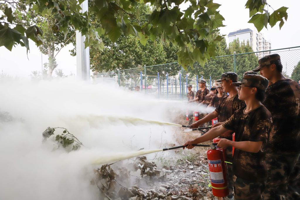 会后,来自各军训连队的学生现场演练了消防水带和干粉灭火器的使用方法和灭火要点