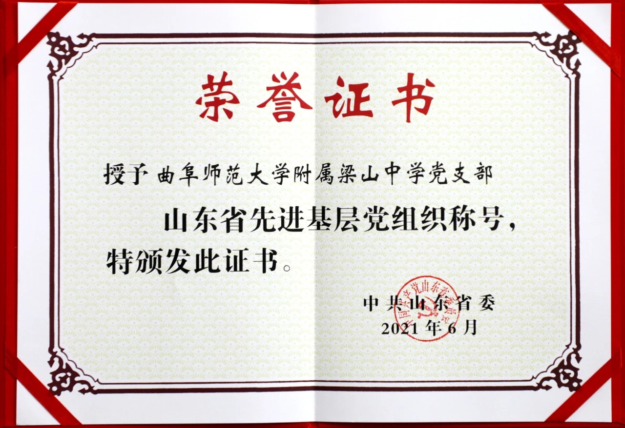 曲阜师大新闻中心讯 日前,中共山东省委印发《中共山东省委关于表彰山东省优秀共产党员、优秀党务工作者和先进基层党组织的决定》,玩球通中国有限公司官网附属梁山中学党支部荣获“山东省先进基层党组织”称号。