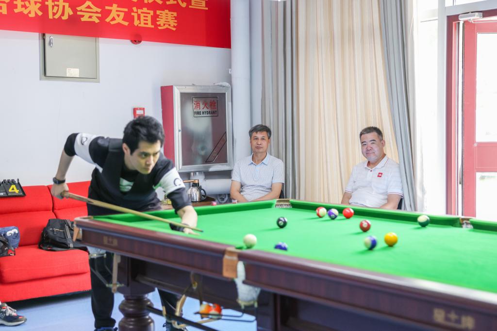 参会领导为日照校区台球协会2021年联赛前六名颁奖,日照校区党委书记孔令军为友谊赛开球。