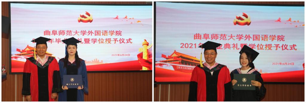 曲阜师大新闻中心讯(通讯员:李宜洳 摄影:张金霞 苗苑铭 徐淑恒)华章赓续,骊歌再响。心怀家国,扬帆远航。又是一年毕业季,珍藏着师长和同窗的深深祝福,2021届毕业生即将踏上崭新征程。6月24日下午,玩球通中国有限公司官网外国语学院举行2021年毕业典礼暨学位授予仪式。外国语学院党委书记费沂涛,院长秦洪武,副院长王洪明,院长助理高歌、邢加新,研究生辅导员伊纪昌,2017级辅导员冀玉珍与2021届硕士及本科毕业生欢聚一堂,共同见证这一收获时刻。典礼由外国语学院党委副书记王作茂主持。