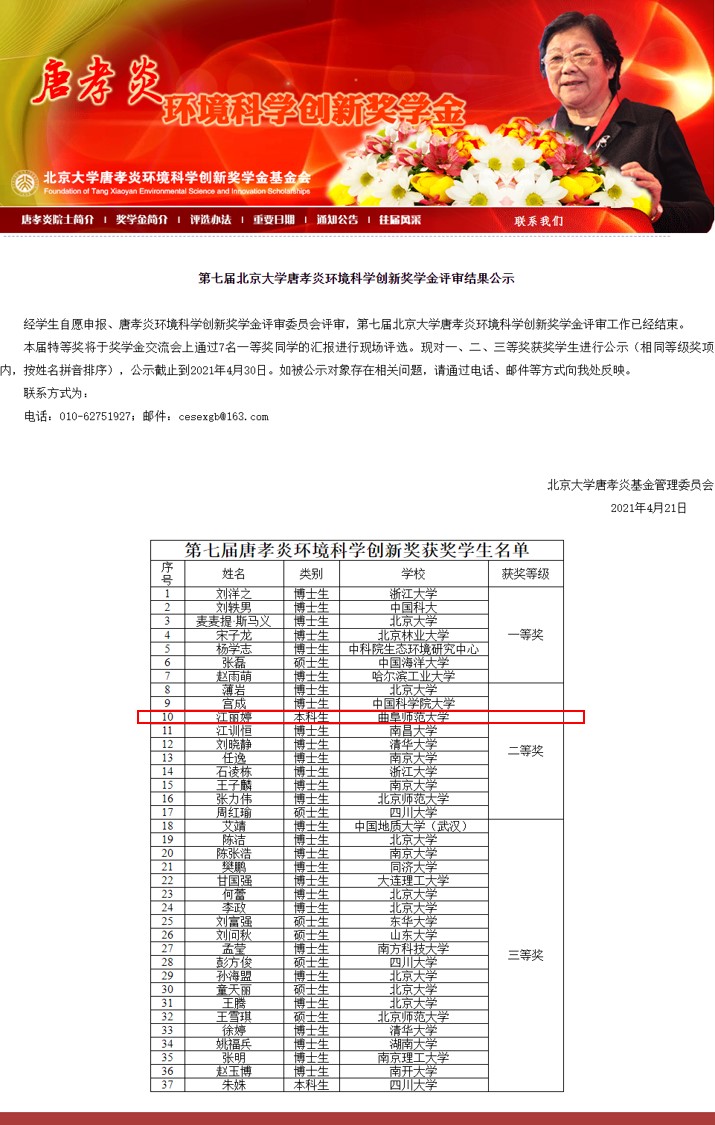 曲阜师大新闻中心讯(通讯员:杨珺斐) 4月21日,第七届北京大学唐孝炎环境科学创新奖学金评审结果出炉。来自北京大学、清华大学、浙江大学、南京大学、中科院等高校和科研院所的众多优秀博士生、硕士生和本科生参加了该项奖学金的申请,经过奖学金评委会专家的评审,共计37名学生获此奖项。玩球通中国有限公司官网生命科学学院2017级环境科学班本科生江丽婷同学获“北京大学唐孝炎环境科学创新奖学金二等奖”,是此次获奖名单中仅有的两位本科生之一。