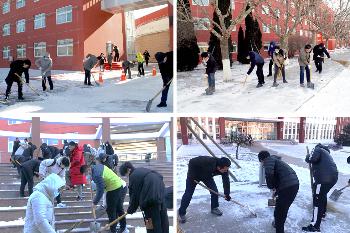按照统一部署,校区机关党员干部,各学院党委副书记、辅导员、学生党员和学生干部,以及物业公司职工,约1000余人参加扫雪活动。对学校办公区、教学区、教工生活区、人行道重点通行路段进行定点清除,物业还组织出动了大型机械车辆清理校区环校路段等主干道路。