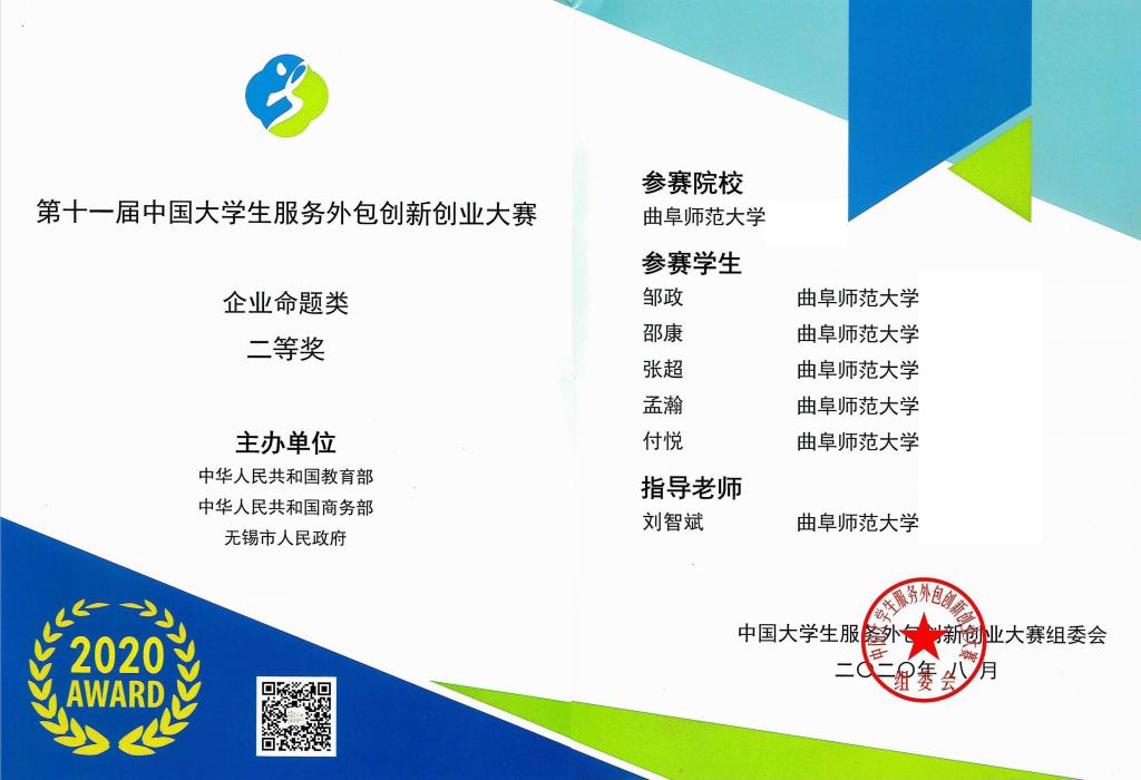 曲阜师大新闻中心讯 近日,计算机学院学生邹政、邵康、张超、孟瀚、付悦五人组成的团队在第十一届中国大学生服务外包创新创业大赛中获得企业命题类二等奖的优异成绩。