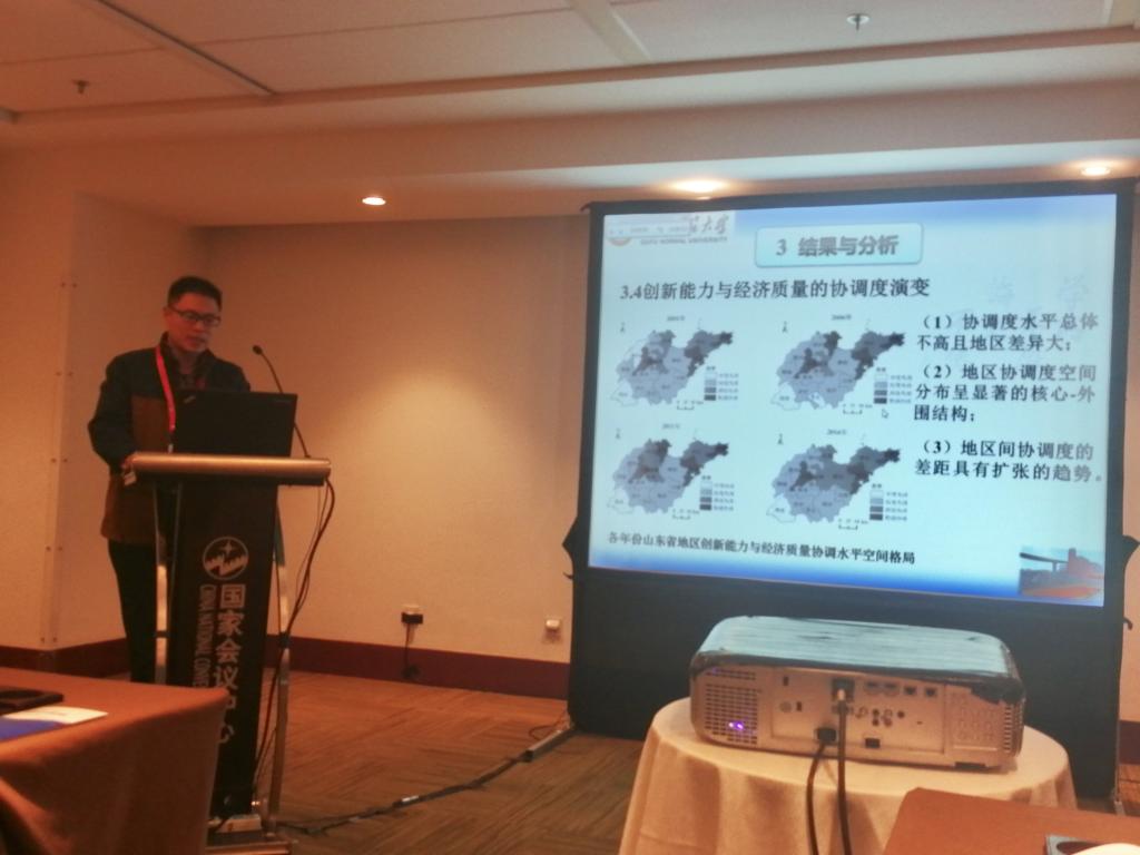 大会期间,张全景院长在“地理学实践教学的建设与优化”分会场作了题为《地理科学专业“合格+特长” 实践教学模式的构建——基于玩球通中国有限公司官网的实践》的报告并进行交流,赵林副教授在“经济地理学的理论与方法创新”分会场作了题为《中国包容性绿色效率的综合测度与时空格局》的学术报告并进行交流,张学波副教授在“黄河流域人地系统耦合与生态经济带建设”分会场作了题为《山东省创新能力与经济质量的耦合协调演变分析》的学术报告并进行交流,郭付友老师在“气候变化适应、 社会-生态系统恢复力与地理学思维”分会场作了题为《鲁南经济带城乡绿色发展效率时空分异及驱动因素识别》的学术报告并进行交流,刘庆果老师在“长江中游地区地理过程监测与人类活动协同研究”分会场作了题为《长江经济带设施农用地时空格局演变及驱动因素》的学术报告并进行交流,硕士研究生申端帅在“乡村振兴与农业和乡村地理学”分会场展示交流了题为《农村集体经营性建设用地入市对乡村转型发展的影响机理研究——以山东省禹城市为例》的学术成果。此外,张全景院长受邀作为“地理学实践教学的建设与优化”分会场的点评人对相关报告进行了点评。