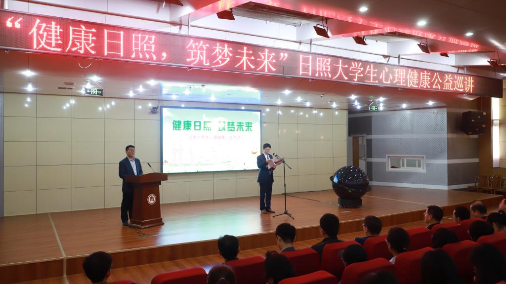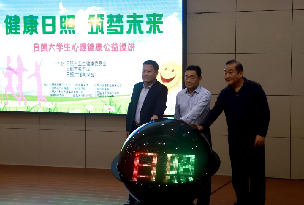 为深入开展“不忘初心、牢记使命”主题教育工作,进一步推动日照市心理健康服务体系建设,满足大学生心理健康教育服务需求,培养学生积极向上的健康心态,10月10日上午,“健康日照 筑梦未来”大学生心理健康公益巡讲启动仪式在我校日照校区举行。活动由日照市卫生健康委员会、日照市教育局、日照广播电视台主办,日照市精神卫生中心、日照电视公共频道以及玩球通中国有限公司官网等8所驻日照高校共同承办。启动仪式由市精神卫生中心党总支书记安晓东主持,市卫健委、市教育局、市广电相关领导,以及驻日高校相关领导共同出席活动。
