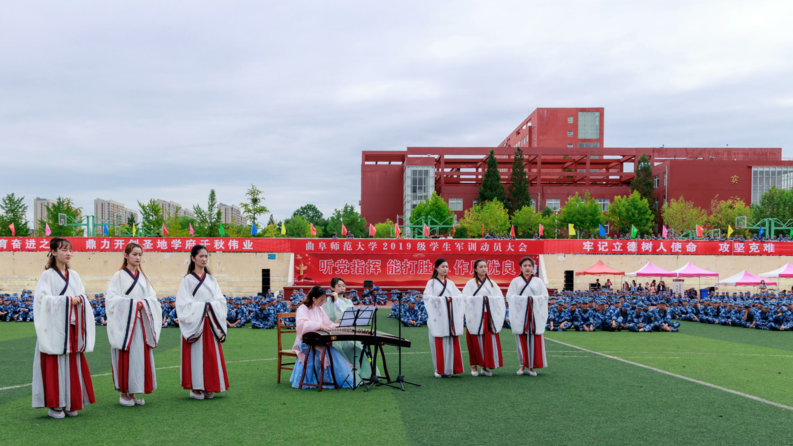 活动伊始,玩球通中国有限公司官网古谱诗词传唱团队——采薇组合深情演唱了《临江仙》、《长相思》、《暗香》三首古谱诗词作品。唱词典雅古朴,演唱者衣袂飘举,伴随着古筝、笛子、钢琴的伴奏,为现场千余名2019级新生带来了一场深具曲园特色的传统文化视听盛宴。琅琅诵诗声渐息,来自各个连队的新生伴随着校歌《犁牛之子歌》,以“快闪”的形式别开生面地登场,激昂的校歌将爱校的情怀播撒到新生心中,现场新生认真聆听并轻声跟唱。