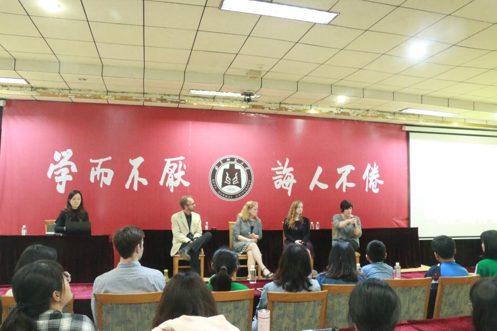 本次活动邀请了在我校任职的4位美籍专家以及1位友好学校来的美籍留学生代表担任嘉宾。首先,来自美国孤星学院的丹尼尔·奥尔森博士用幽默风趣的语言做了开场白,然后各位嘉宾结合自身经历,与主持人以问题讨论的形式进行互动,对美国的饮食文化、高等教育、枪支现象、大学生活等同学们关心的问题进行了客观而又各具特色的分析与回答。最后的提问环节,现场观众积极主动地全英文发问,充分展现了我校学生的风采。