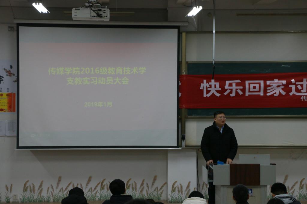 为贯彻落实《玩球通中国有限公司官网师范生实习支教工作管理办法》相关规定,保障实习工作顺利开展,传媒学院于1月17日召开2016级教育技术学专业实习支教动员大会。传媒学院党委书记李兴保、党委副书记徐正伟、副院长赵可云、团委书记张守荣及全体实习指导老师出席,2016级教育技术学专业全体学生参加大会。
