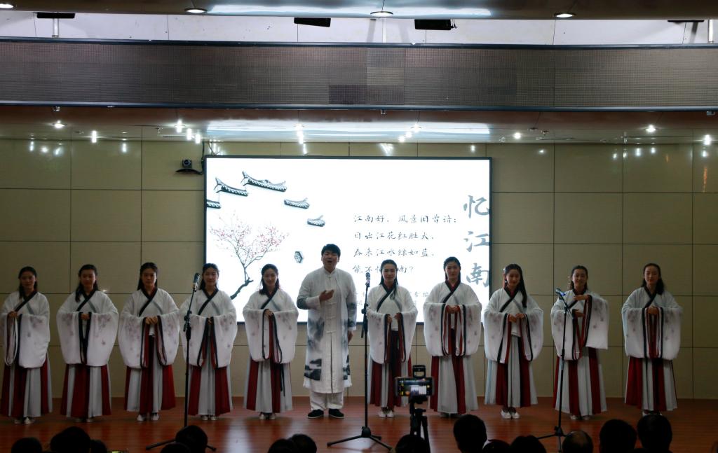 仪式上,杨赛与孔令军共同为我校“古谱诗词传承人才培养基地”揭牌。周彩霞和张晓琼为我校大学生古谱诗词传唱团队——“采薇组合”导师张建华、王茜、王红霞、吕爱梅四位老师颁发导师聘书。肖桂彬为“采薇组合”首批入选的学生代表颁发荣誉证书。刘蓉在致辞中总结了近年来校团委为弘扬传统文化所做的工作及取得的成绩,并对“古谱诗词传统人才培养基地”落户我校后的发展给予希望。随后,“采薇组合”依次展演了《忆江南》、《杨白花》、《秋风辞》、《菩萨蛮》、《渔歌子》,《大江东去》六首诗词,为现场观众带来了一场高标准的艺术表演。