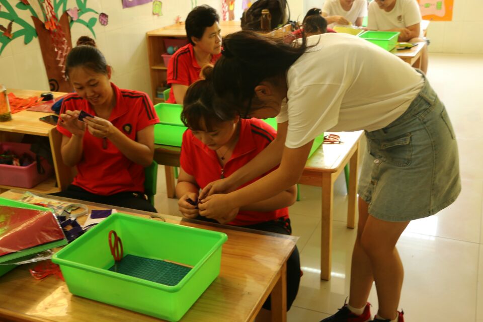 仪式结束后,软件学院“裁云剪水”传统文化志愿服务队的同学们走进教室,为幼儿园老师讲授剪纸文化艺术。幼儿园老师们饶有兴趣地欣赏了志愿者团队成员带来的剪纸作品,拿起剪刀和彩纸,认真学习剪纸。据悉,本次社会实践为期一周,团队成员将向幼儿园老师深入讲解剪纸技巧、剪纸样式以及中国结编织等相关内容。