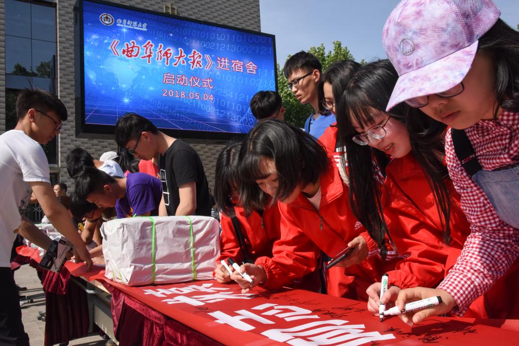 仪式上,纪洪涛向李玉伟赠送《曲阜师大报》,标志校报进宿舍活动正式启动。随后,现场师生一同在宣传条幅上签名留念,承担报纸发放工作的同学走进宿舍与宿舍管理人员一同为大家分发校报。据悉,校报进宿舍是校报发行方式的一次改革,目前,校报发行范围覆盖千余名校友代表、全校师生员工、50余家国家级省级重点媒体和200余家兄弟高校。