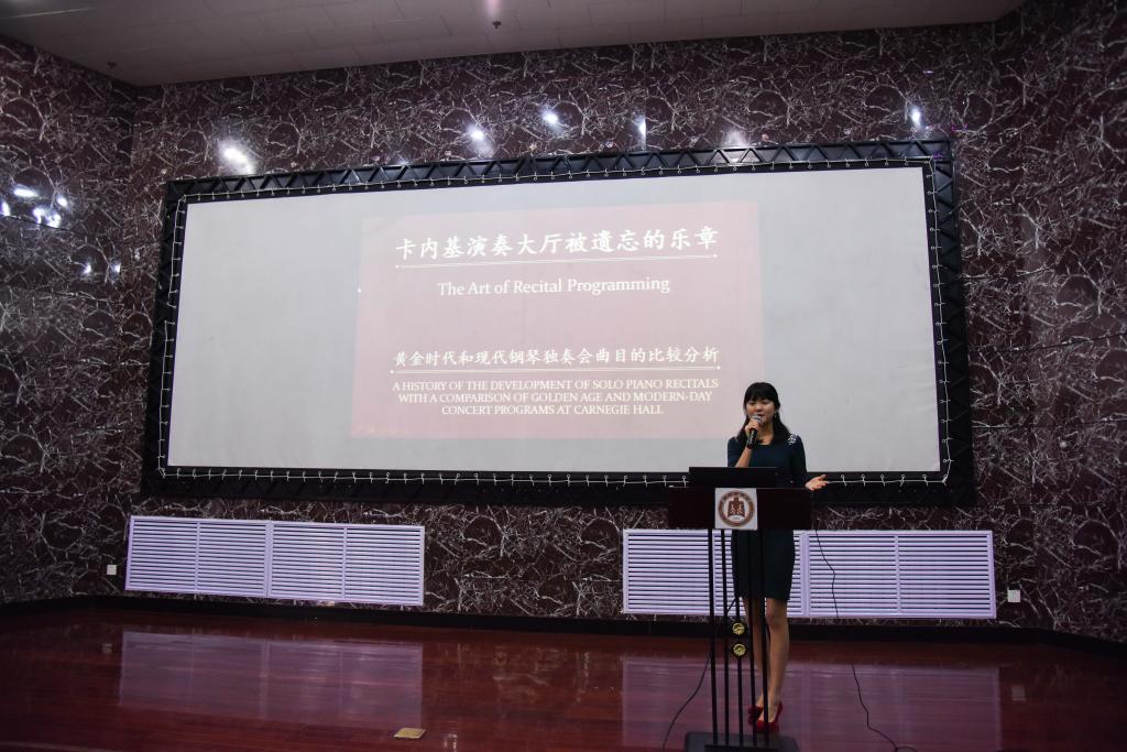 葛宇轩博士的演讲着重于黄金时代和二十一世纪的最具代表性的钢琴家在卡内基演奏厅的独奏曲目,她通过对黄金时期和二十一世纪钢琴家及其演奏曲目的分析,阐述了一个多世纪以来钢琴独奏曲目的变化。她认为,越来越多的钢琴家精专于某些作曲家或风格导致了如今钢琴独奏音乐会的风格单一。讲座中葛宇轩博士带领大家追寻了黄金时期钢琴家的演奏会和部分曲目,并希望当今的年轻钢琴家们能够找回黄金时期那些辉煌和令人陶醉的音乐篇章。