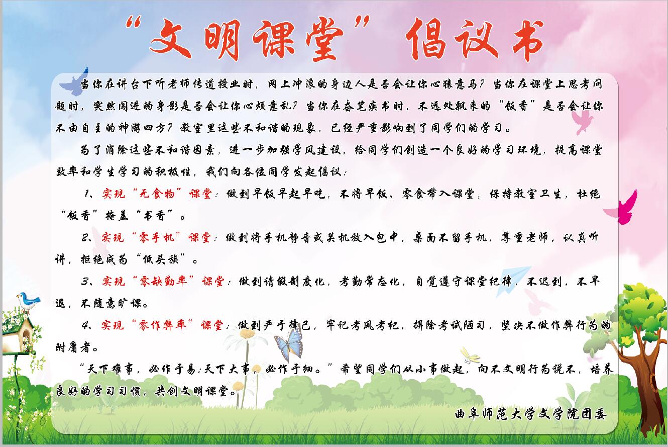 近期,为进一步落实我校教务处《关于进一步加强课堂教学秩序管理的意见》文件要求,同时营造文学院浓厚的学习氛围,文学院向全体师生发出创建“文明课堂”的倡议,并开展了建设文明课堂的系列主题活动。