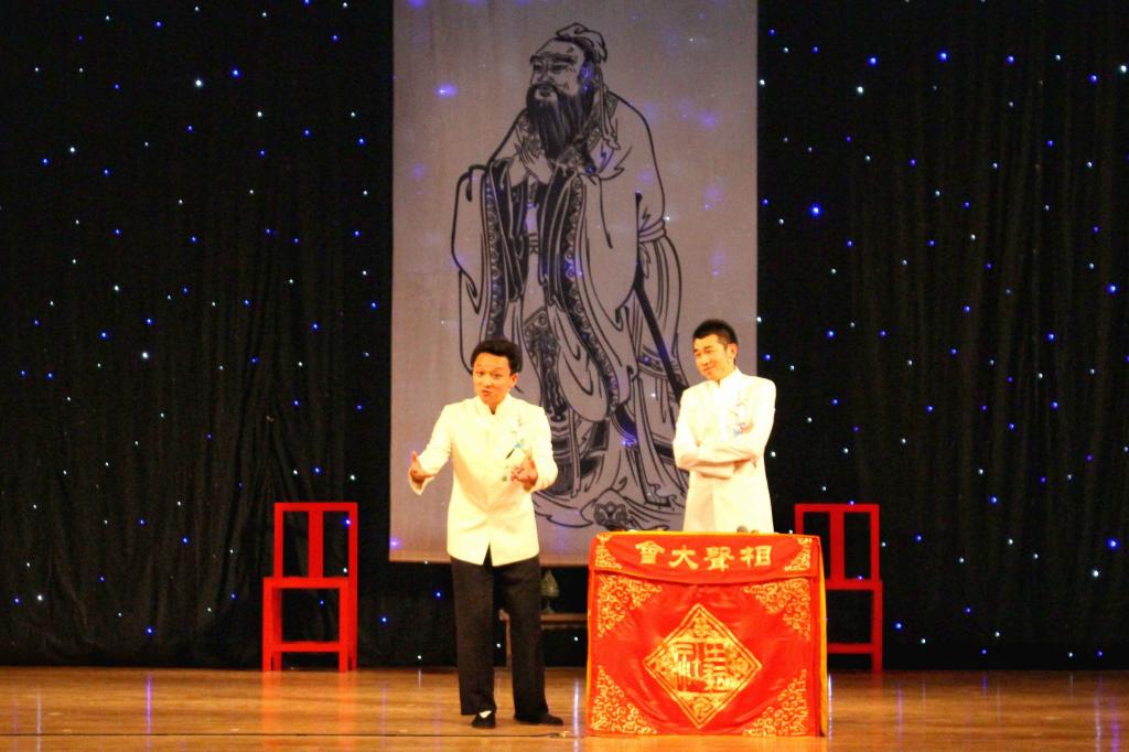 一张案桌,二席长袍,上海田耘社的相声演员一出场,便赢得了观众的阵阵掌声。创始人兼相声、快板书演员赵松涛首先向观众们介绍了本场表演的主题及文化内涵,喜闻乐见的双口相声为本场演出拉开了帷幕。演员们用诙谐幽默的对话、生动形象的表演为观众们展现了孔子的生平概况,并用欢快的情景剧和优美的舞蹈讲述了孔子一生历经坎坷,终成一代圣人的故事。表演笑料百出,却又不失文化内涵。