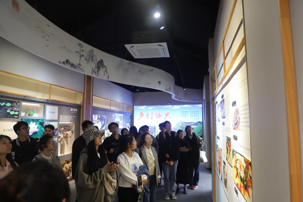 来到铁道游击队纪念园,庄严肃穆的纪念馆,高耸入云的纪念碑,鲜活生动的人物群雕,震撼的全息投影展现了中国共产党领导的铁道游击队等抗日武装的英雄事绩,师生共同缅怀先烈,深深感动于先烈们不畏牺牲的革命精神和英勇机智的战斗谋略。穿过战火硝烟来到新中国展厅,师生见证了在中国共产党的带领下微山县的历史发展,尤其在“乡村振兴”战略指导下,微山县人民大力发展渔农产业,使乡村面貌焕然一新。泛舟湖上,研学团队了解到微山县南四湖一直致力于推进生态治理,全面提升绿色低碳发展水平,才有了如今微山湖的草丰水美,切实领悟到“绿水青山就是金山银山”的深刻道理。研学团队最后参观了渔家民俗馆,了解了世代渔民的生产生活状况,调研了当代渔民的生活情况。