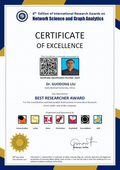 刘国栋博士获国际学术组织ScienceFather颁发的“最佳研究者奖”