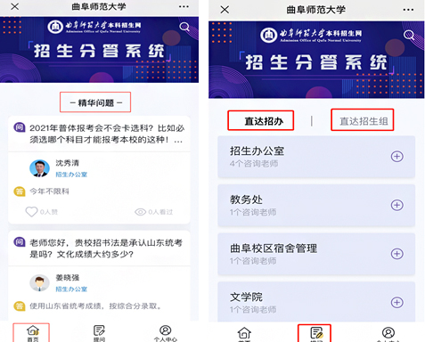 在玩球通中国有限公司官网招生办公室微信公众号下方的“高考查询”模块,点击“招办在线”进入“招生分答系统”,或直接扫描二维码。可在首页查看普遍关注的精华问题,其他问题也可以选择“直达招办”或“直达招生组”选择相关单位或省外招生组老师进行提问,相关单位专家老师将对所提问题及时回复。