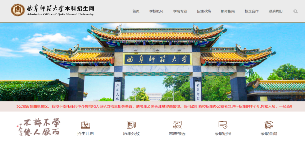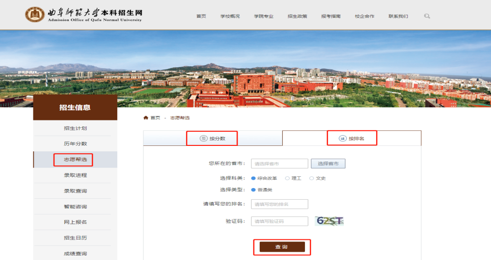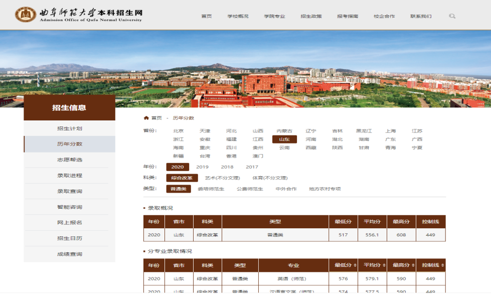 登录玩球通中国有限公司官网本科招生网(https://zsb.qfnu.edu.cn),可以查看学校概况、学院专业、招生政策、近两年招生计划及各专业录取分数、报考指南等信息。同时,提供“志愿帮选”服务,进入服务后可以选择“按分数”或“按排名”查询。