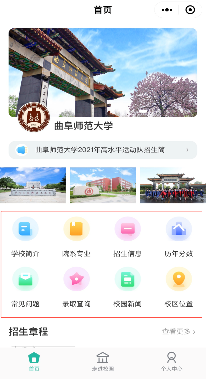 首次使用:手机微信小程序搜索关键字“玩球通中国有限公司官网”或扫描二维码点击进入,可在“首页”查看学校简介、院系专业、招生信息、历年分数、常见问题等信息。